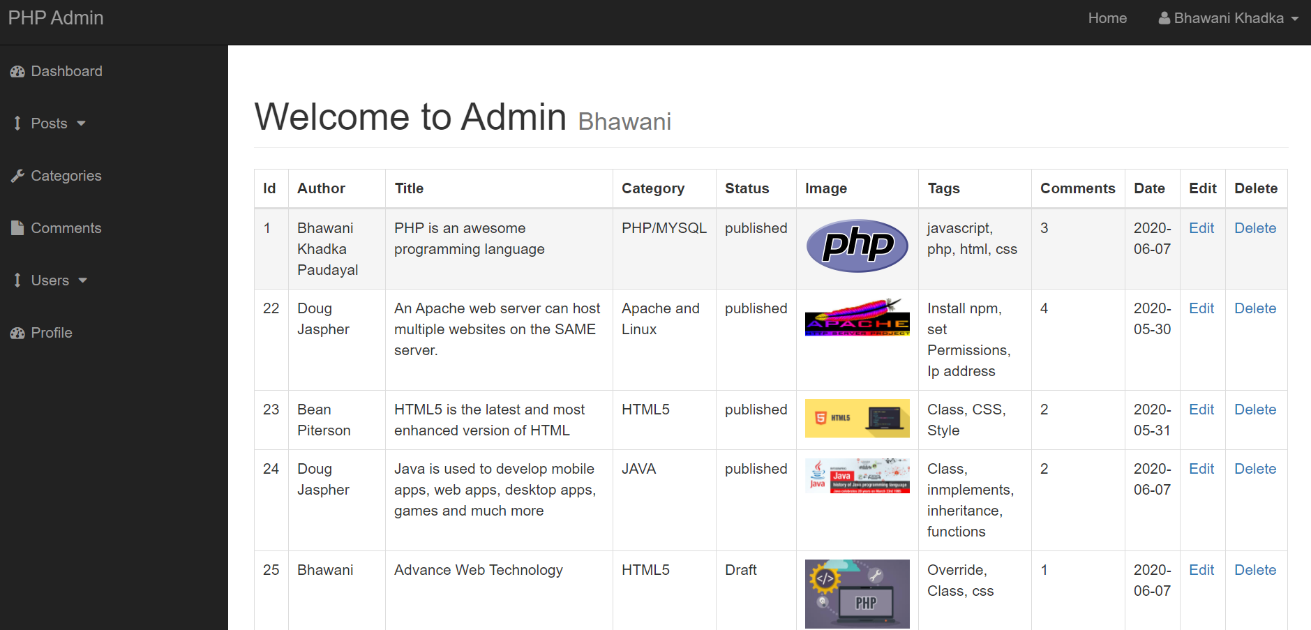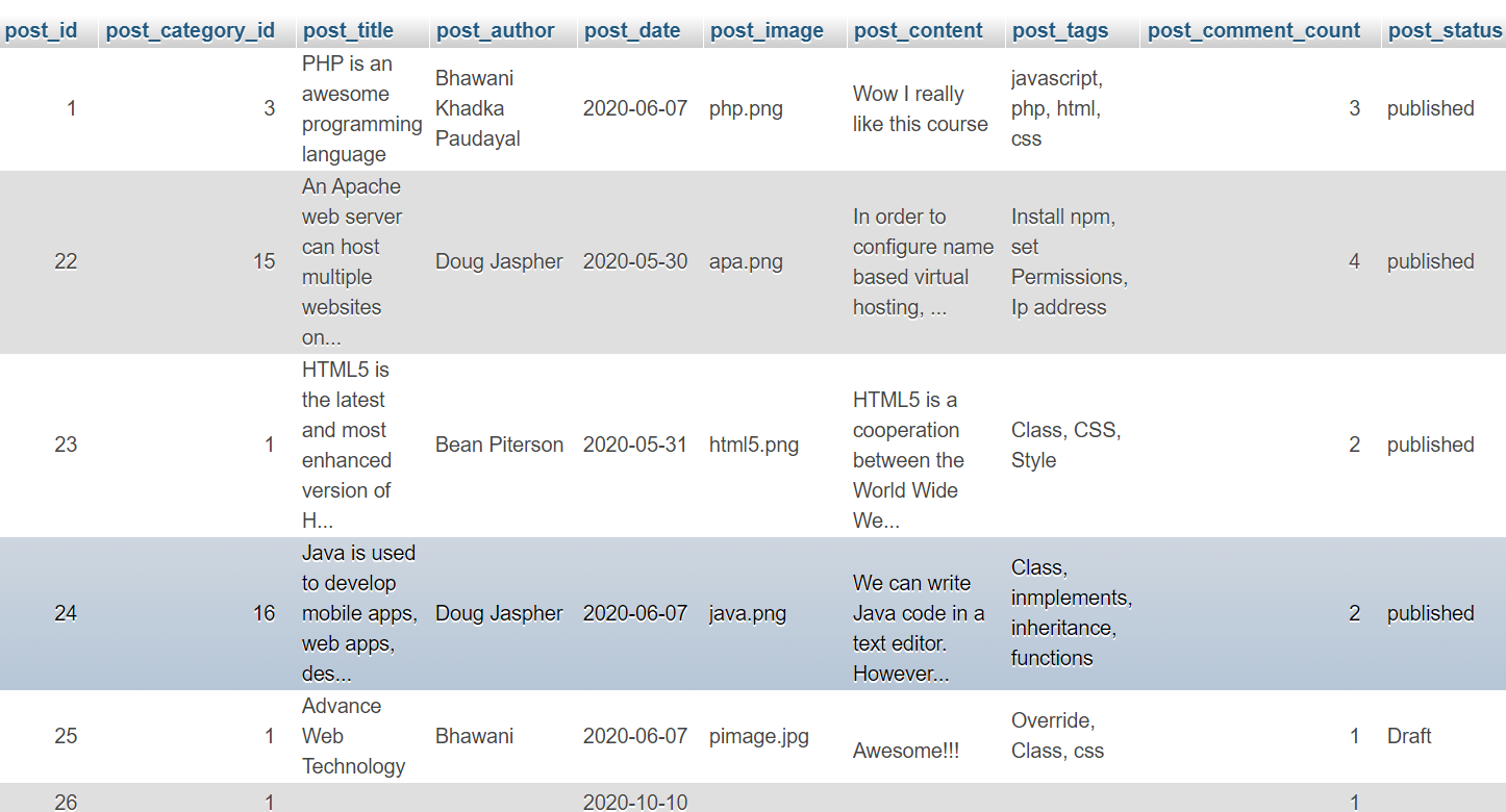 Admin can view all the posts, update posts, delete posts and add posts from the admin page or direct from the PhpMyAdmin database.