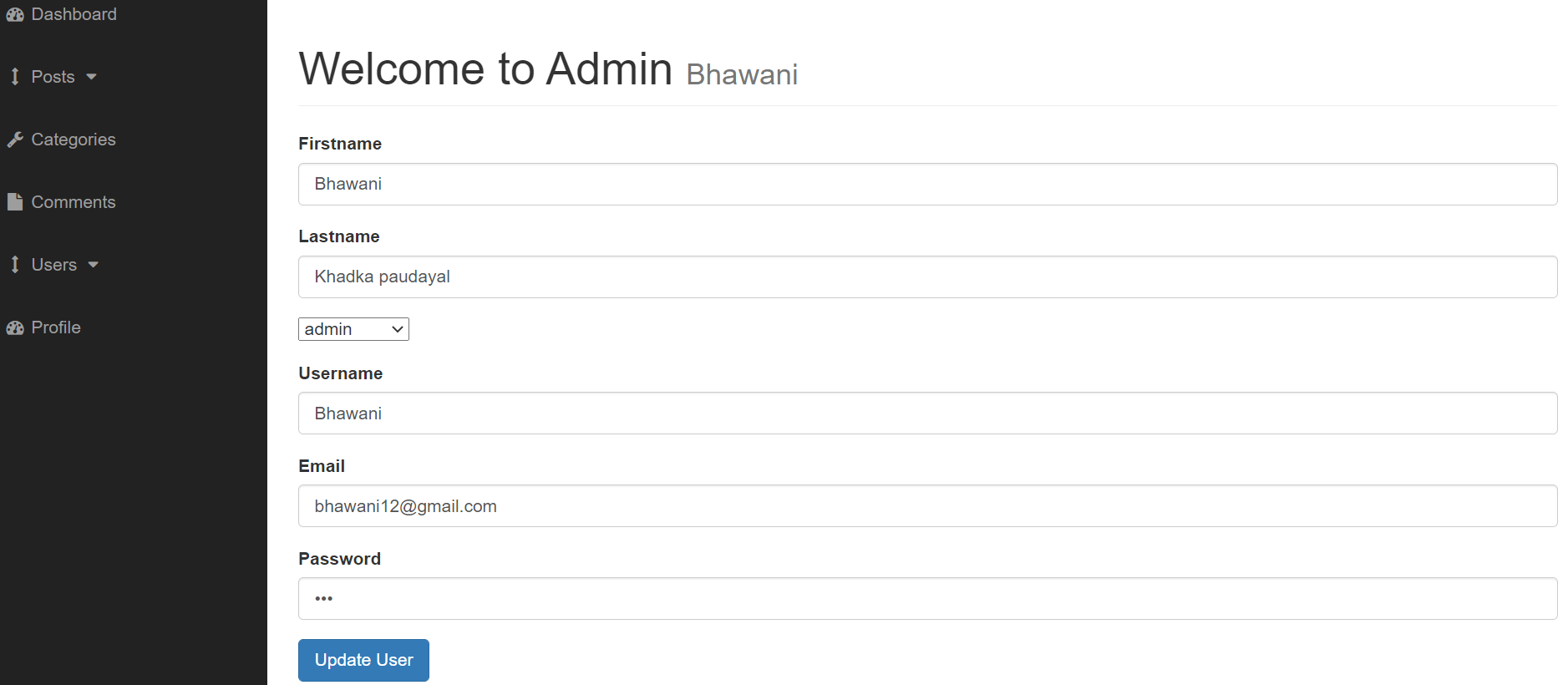 This screenshot is taken inside the admin dashboard page from the updated user.